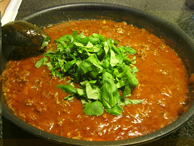 Fräs på färsen i smör eller kokosfett, hacka under tiden lök, vitlök och morot. När färsen brynt klart fös den lite åt sidan i stekpannan och fräs på lök, vitlök och morot. Blanda sedan alltsammans. Krydda efter smak med oregano, vitlöks, paprika och chilipulver samt tomatpurè. Fräs på en stund så att färsen får en fin yta av kryddorna. Ha sedan i buljongtärningen, vattnet och passerade tomaterna. Salta och peppra. Låt koka ihop i 15 minuter. Ha sedan i den grovhackade basilikan och rör runt.